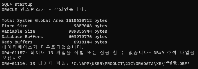 ORA-01157: 데이터 13 파일을 식별 또는 잠금 할 수 없습니다- DBWR 추적 파일을